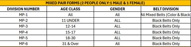 Age & Rank: As shown in the table above, the Mixed Pair divisions for Black Belts are organized into six distinct categories based on the age of the competitors.