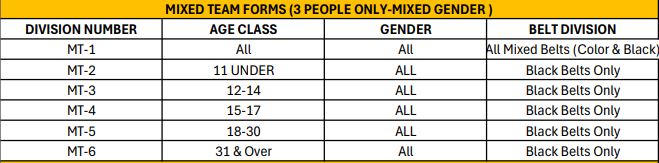 Age & Rank: As shown in the table above, the Mixed Team divisions for Black Belts are organized into six distinct categories based on the age of the competitors.